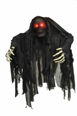 72 Inch Animated Hanging Phantom-Â This 72-inch Hanging Reaper life-sized prop has blow-molded elongated head and hands with poseable arms, light-up eyes, and a tattered costume with hood and gauze details. There is a motion-sensor activation for the sounds he speaks, and there is a volume control. He makes creepy moaning sounds! Just the scary prop you need for your Halloween setting!